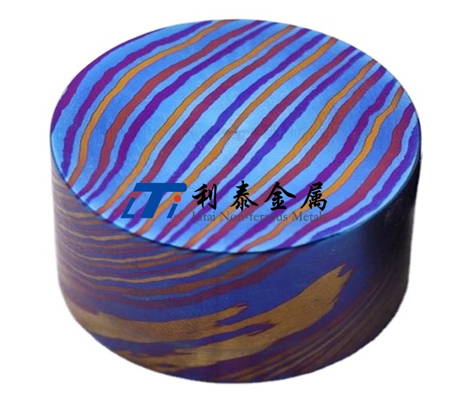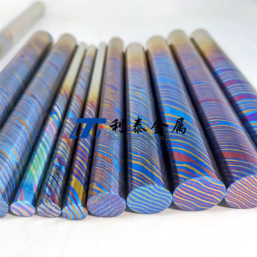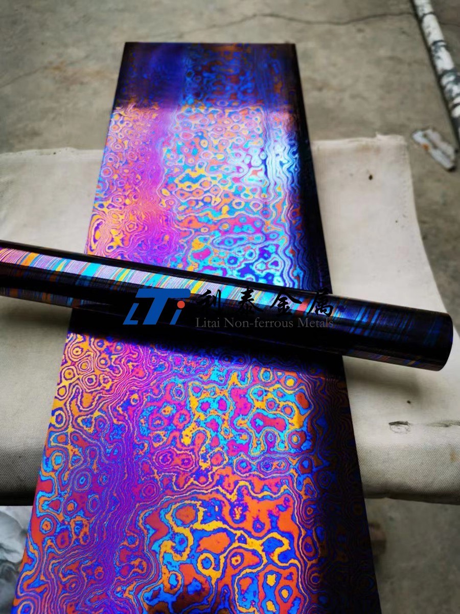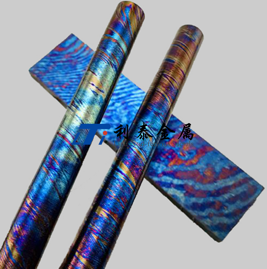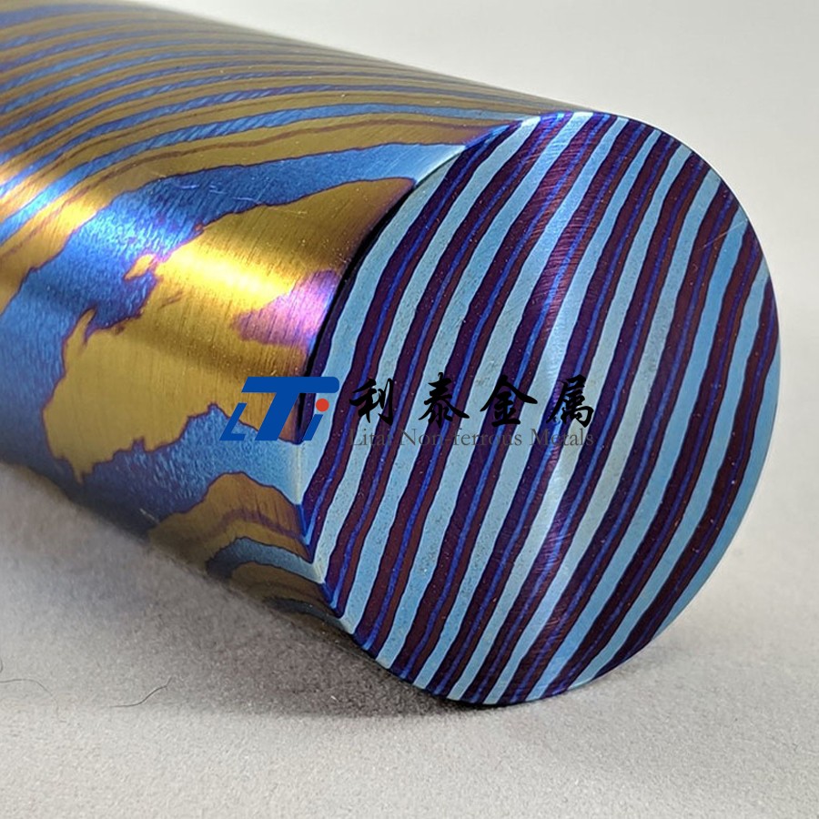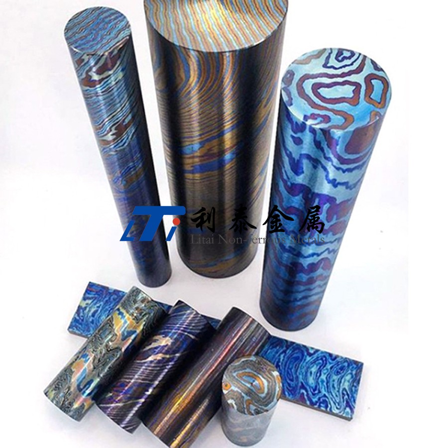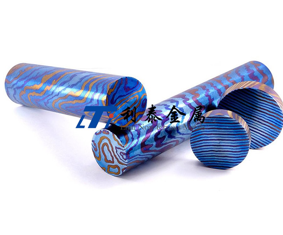 鈦馬士革是由兩種或兩種以上的鈦合金疊鍛而成。然后通過(guò)熱處理(鈦燒藍(lán))或者陽(yáng)極氧化,形成不同的顏色分層的鈦合金材質(zhì)。
